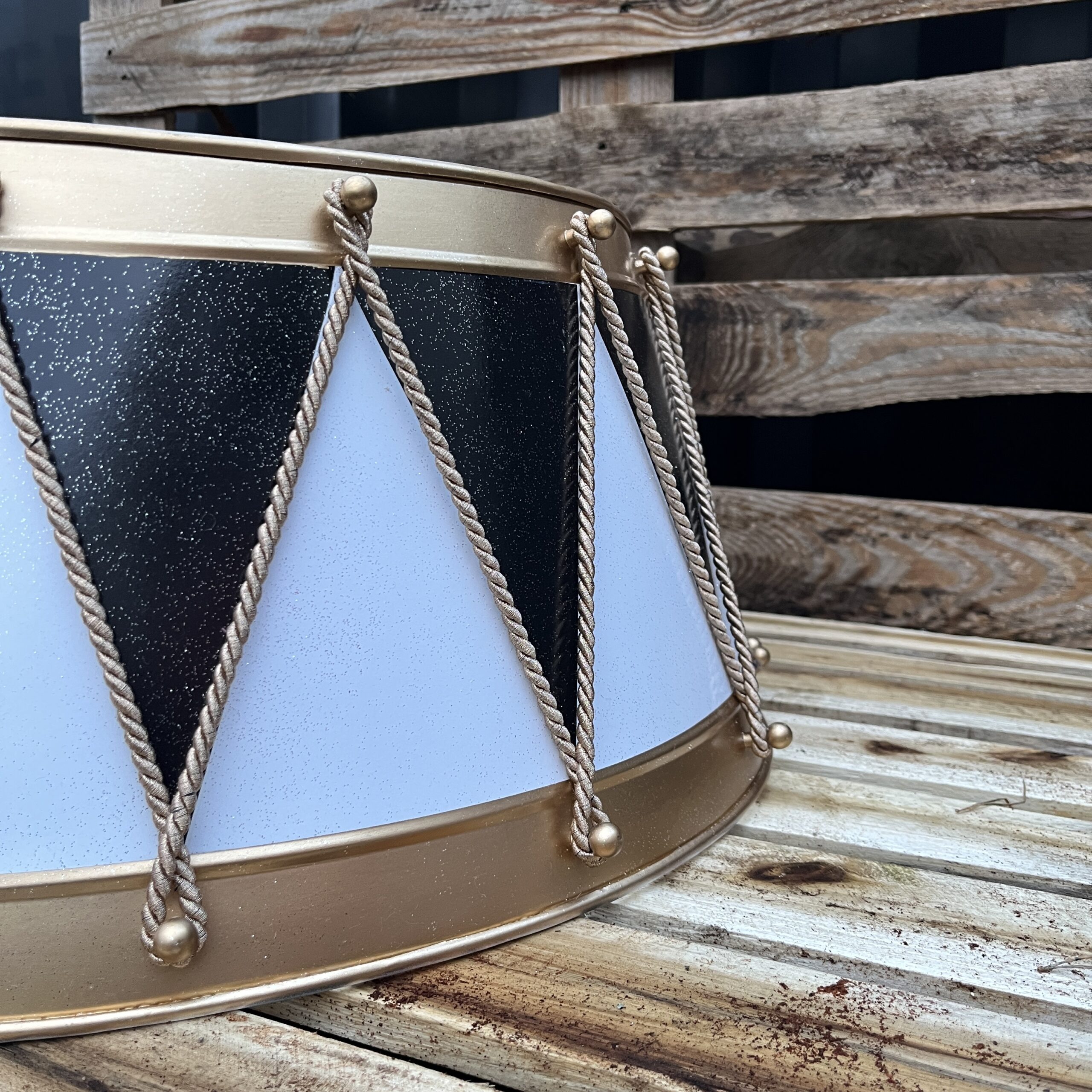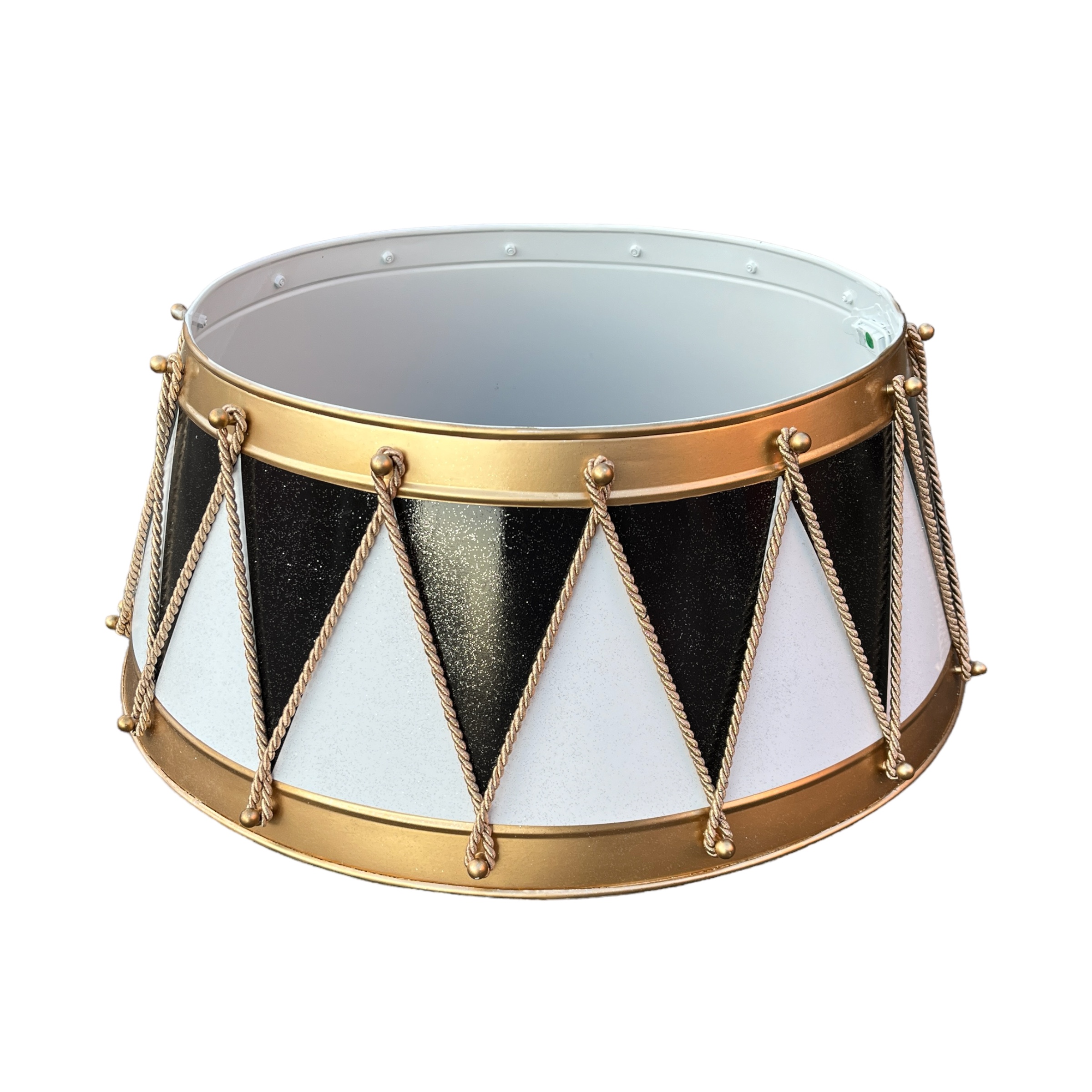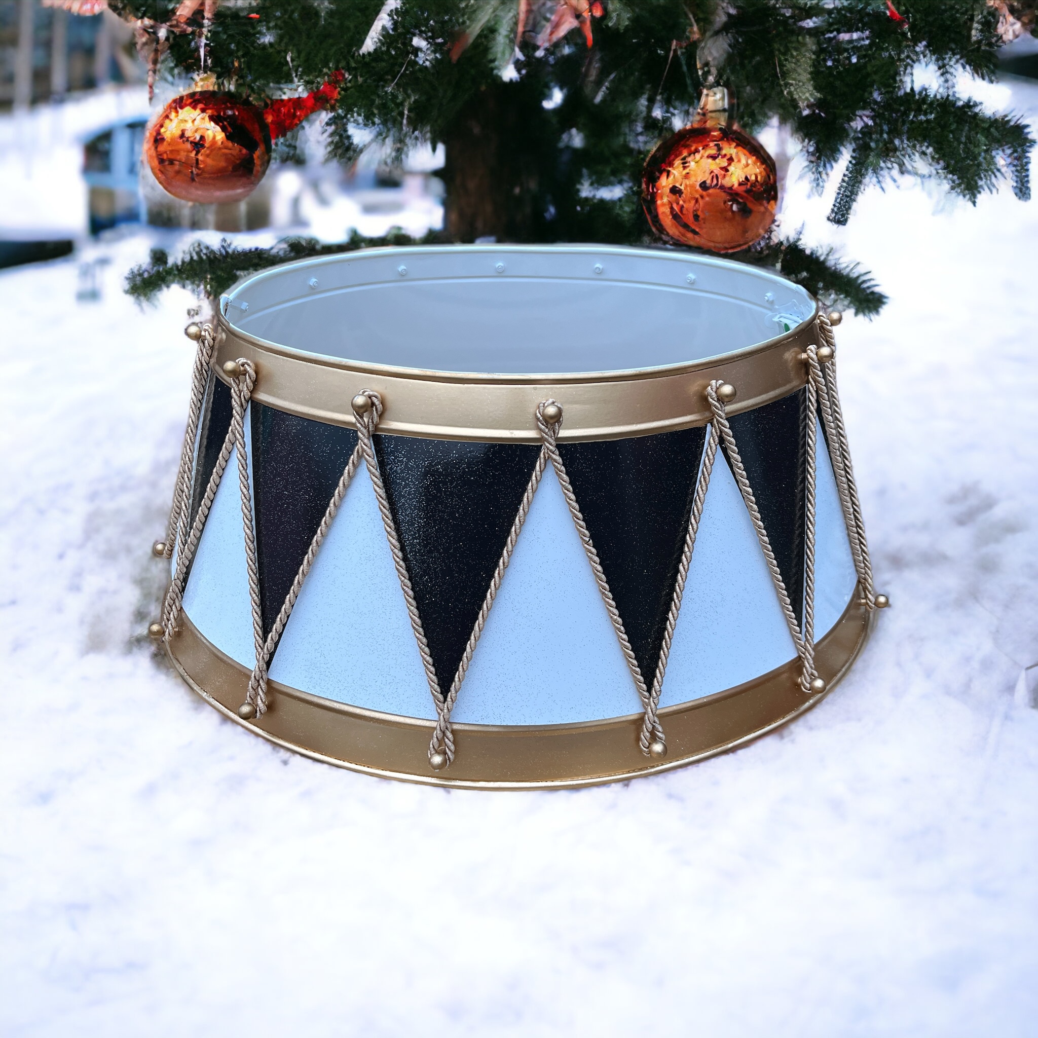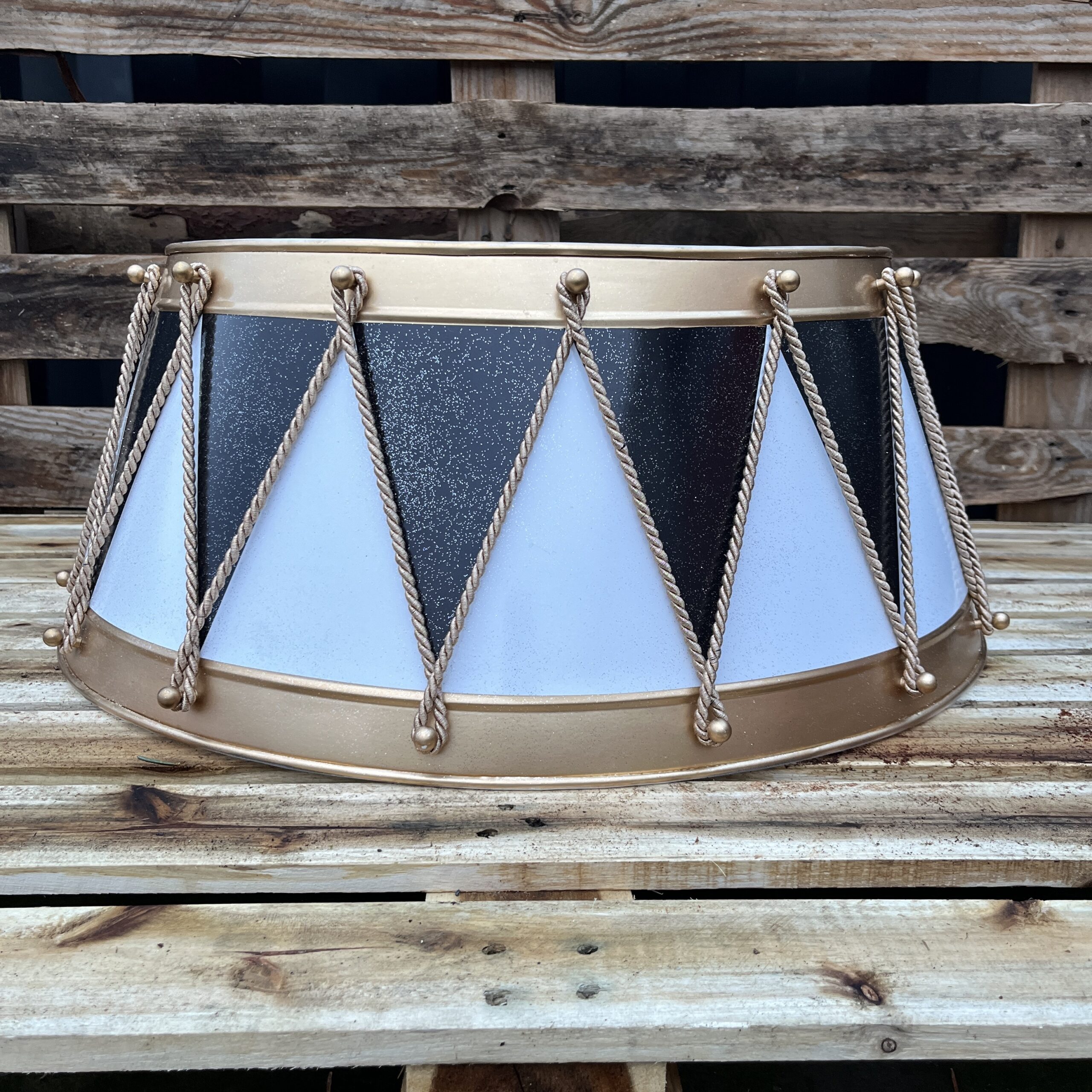 Skjuleren til juletræet er fremstillet i galvaniseret håndbanket stål samt håndmalet på begge sider af produktet. Skjulerne kan skilles i to dele for nem nedpakning efter julen. Juletræsskjuleren passer til alle slags fødder til juletræer. Pas godt på din skjuler, så den kan gå i arv i familien. Dansk design når det er allerbedst og med en masse glimmer og glitter. Alle vores skjulere er håndmalet med rolig hånd, for at opnå det smukke udtryk på ydersiden af trommen. Ingen af vores juletræsskjulere er fuldstændig ens og kan derfor godt varigere i udtrykket, hvilket også er med til at gøre hver tromme unik og flot.